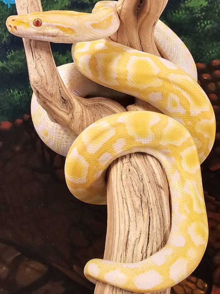 - Stunning albino coloration with white, gold, and yellow patterning